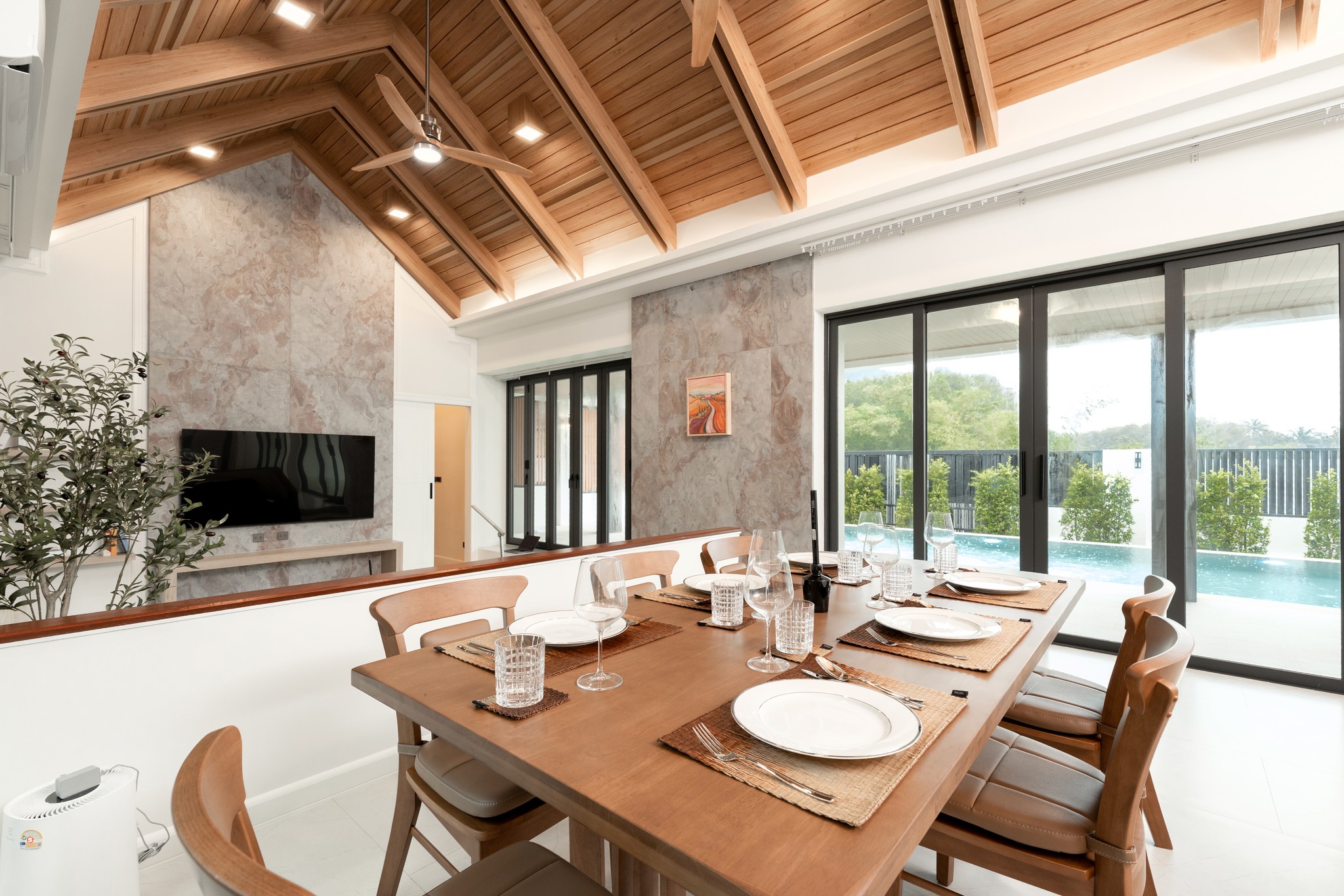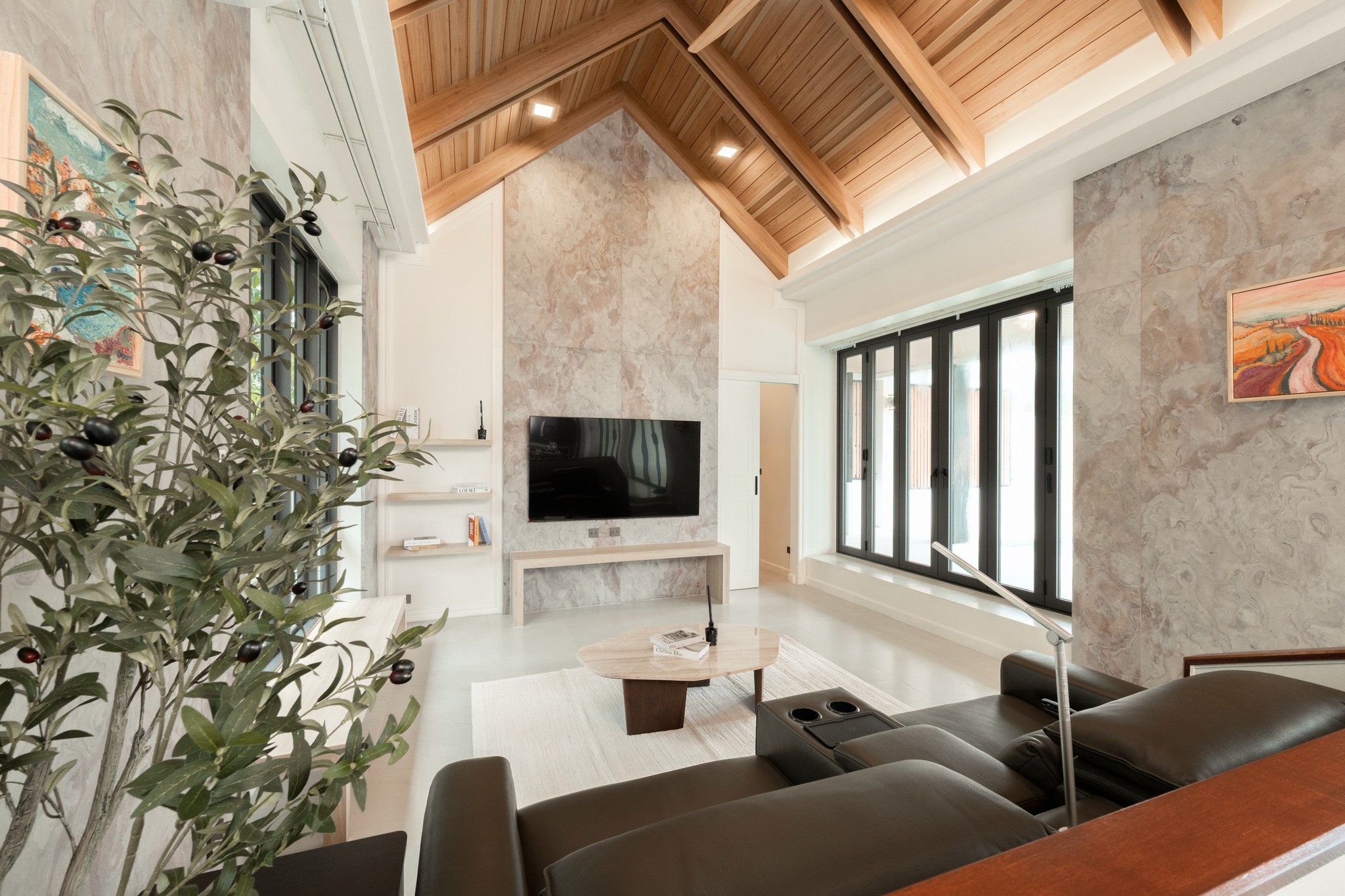 The living area is enhanced by natural stone walls and subtle indoor greenery, bringing a sense of calm, texture, and connection to nature into the home.