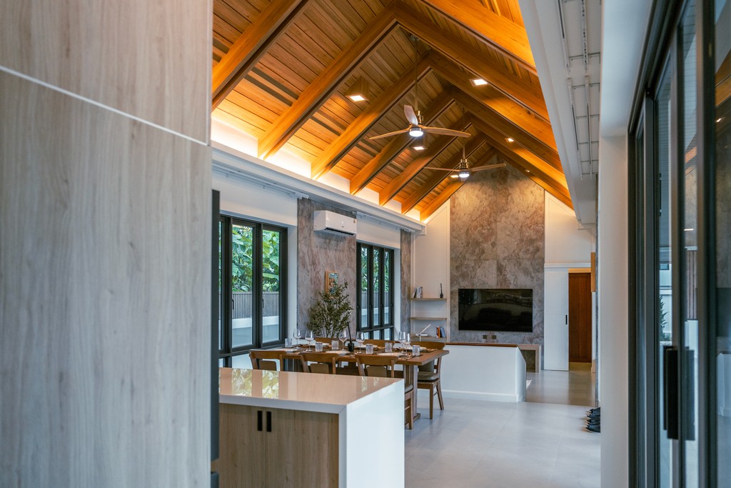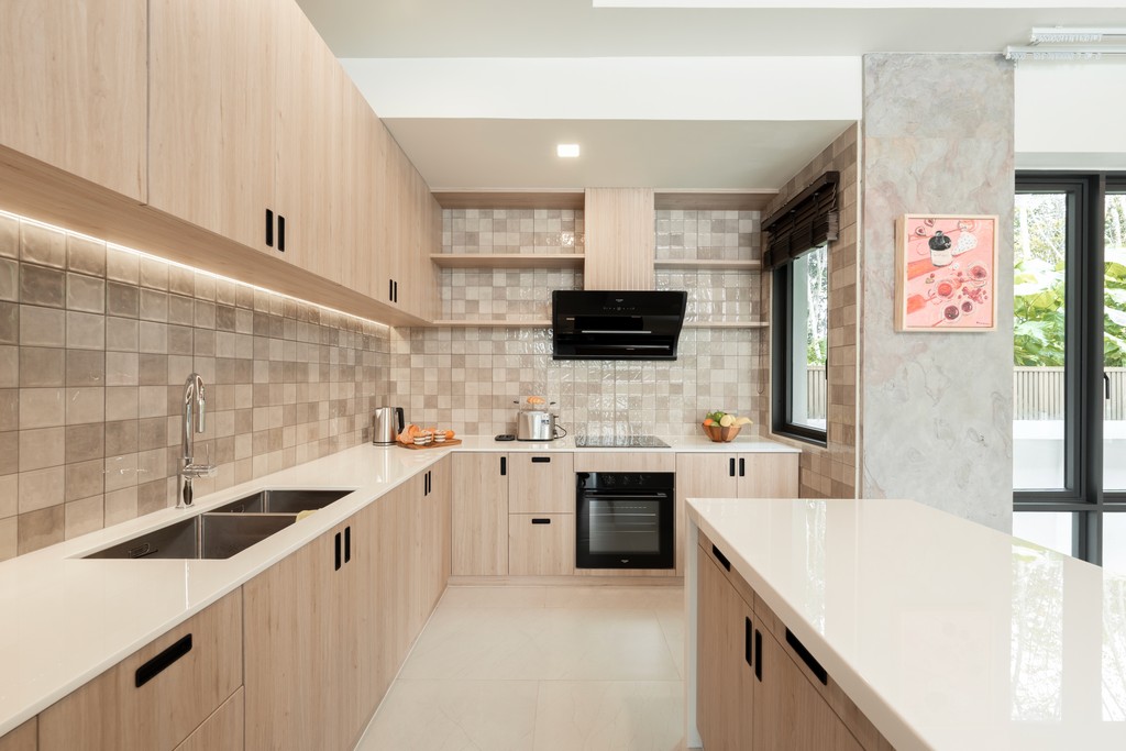 The pantry kitchen is designed with a refined open-plan layout, combining European functionality with warm tropical character.