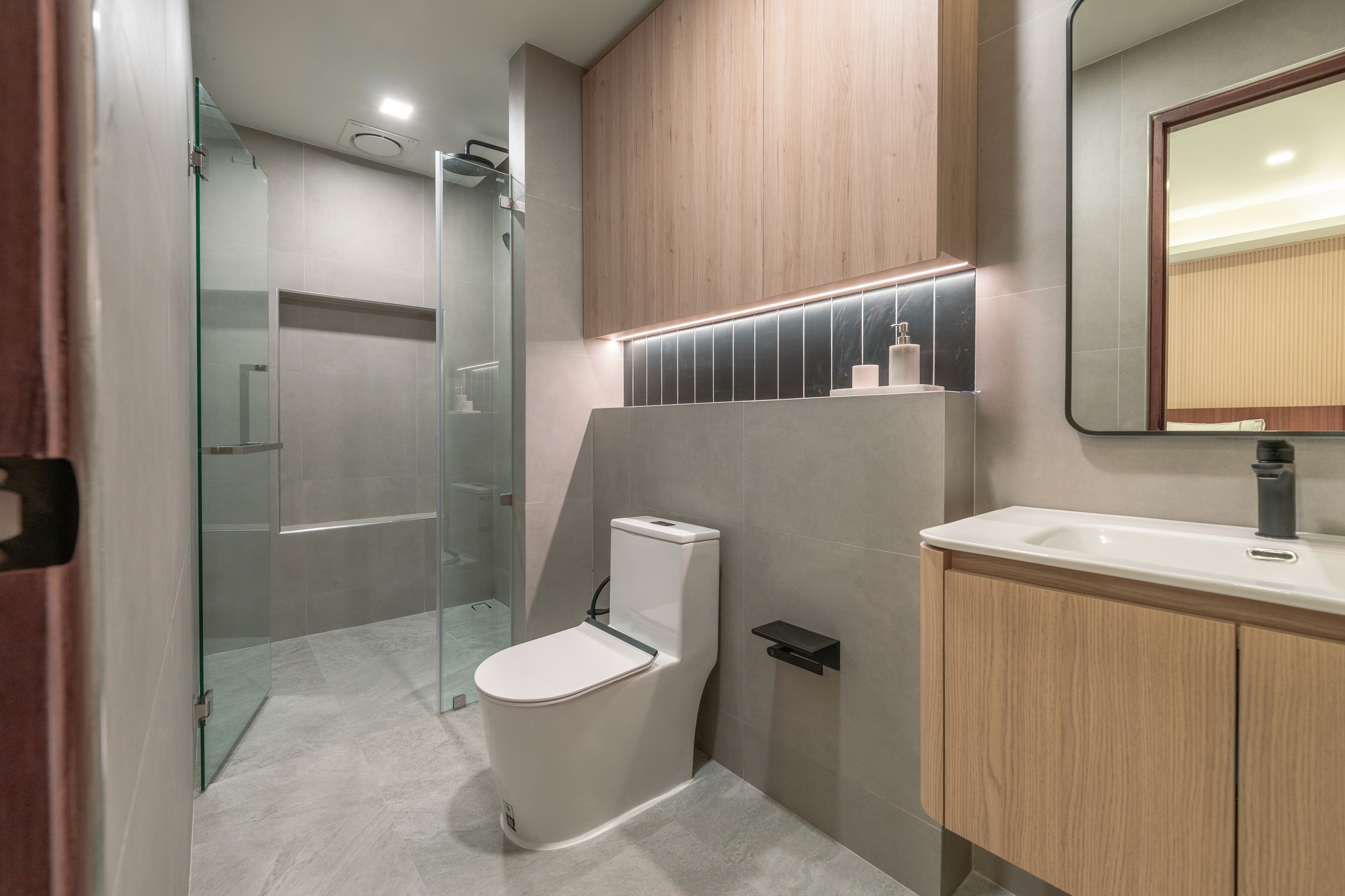 Inspired by modern Bali architecture, the space blends warm natural materials with expansive glass panels that invite natural light and greenery into the room.